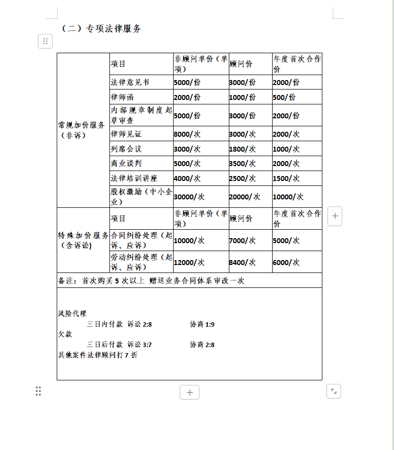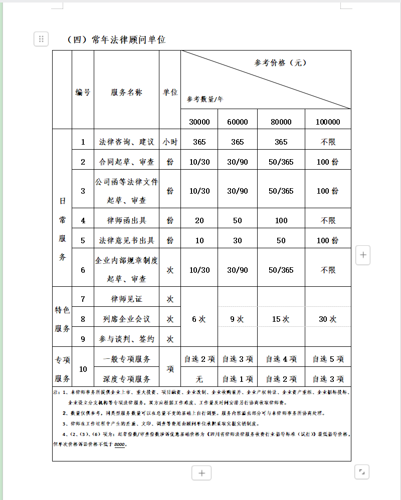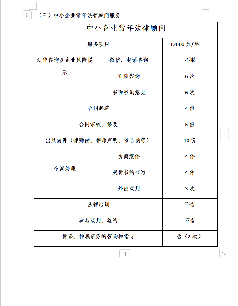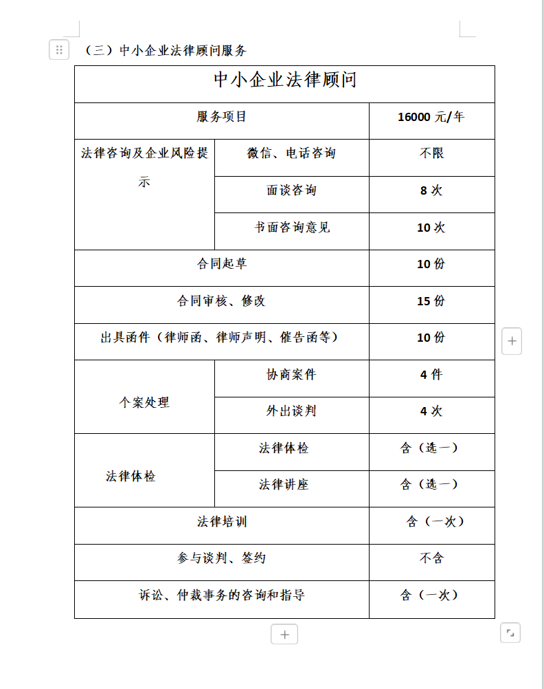 1、法律咨询;2、常年法律顾问服务;3、专项法律顾问服务;4、诉讼服务