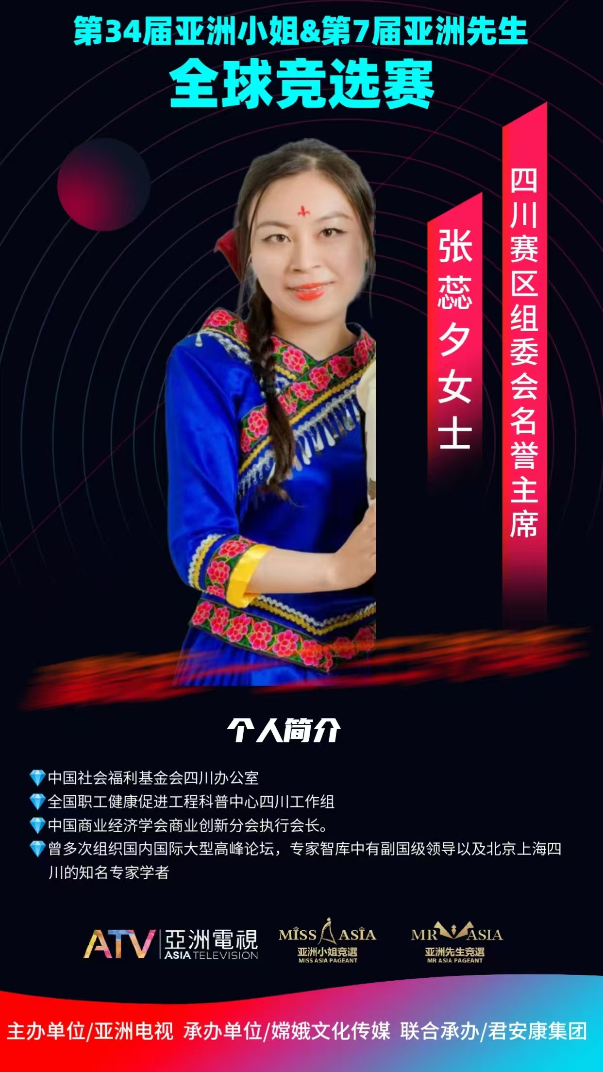 张蕊汐:原名张洁,情感心理咨询师,中国商业经济学会商业创新分会执行会长,全国职工健康促进工程四川工作组副组长,第34届亚洲小姐&第七届亚洲先生四川赛区组委会荣誉主席.