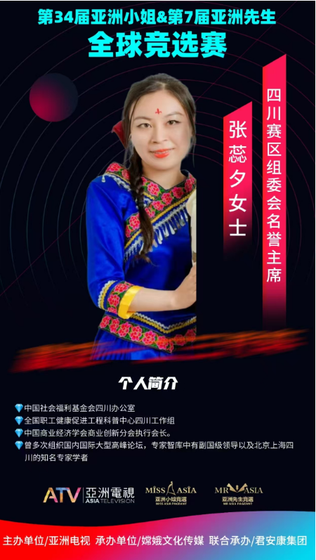 张蕊汐:原名张洁,情感心理咨询师,中国商业经济学会商业创新分会执行会长,全国职工健康促进工程四川工作组副组长,第34届亚洲小姐&第七届亚洲先生四川赛区组委会荣誉主席.