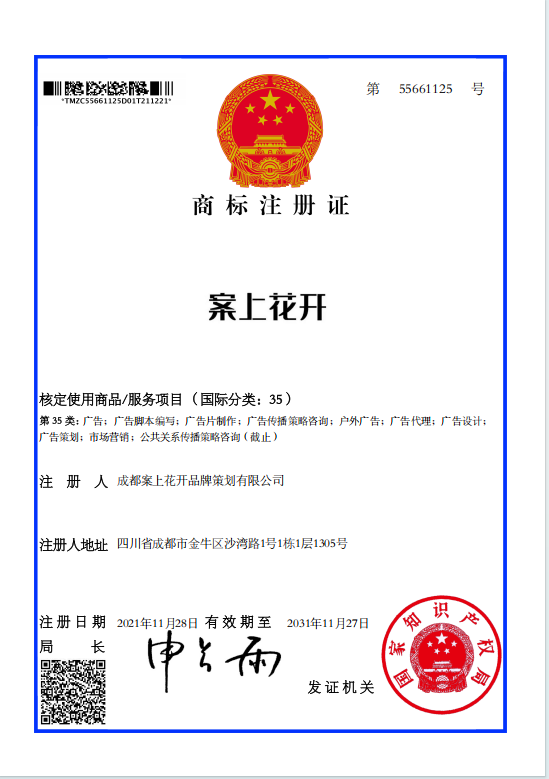 成都案上花开品牌策划有限公司(以下简称“案上花开”),是一家“播种落地→生根发芽→抽枝散叶→开花结果”,引领企业成长的创新型服务公司。