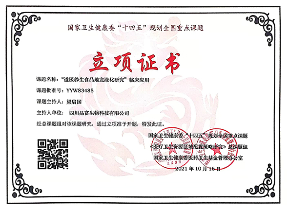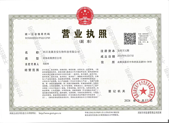 2014年/工作室成立 公司引进技术人才,组建地龙(蚯蚓)古法炮制技术研发工作室。 2017年/项目公司成立 技术团队成功突破古法炮制技术壁垒;同年,成立了项目公司。 2018/首批产品上市 地龙原液古法炮制技术研发成功;同年,小试基地建成并成功 生产出地龙原液产品,首批“地龙饮”产品成功上市。 2020/中试基地落成 公司中试基地落成,小批量“地龙饮”产品进入市场 2021/研发新品 公司研发新品“地龙抑菌喷剂”进入市场。 2022/销售公司成立 公司研发新品“地龙舌下喷剂”进入市场;公司先后生产的三款 产品,在广大消费客户使用后,反馈信息效果明显。同年,四 川龙康圣安生物科技有限公司正式成立。